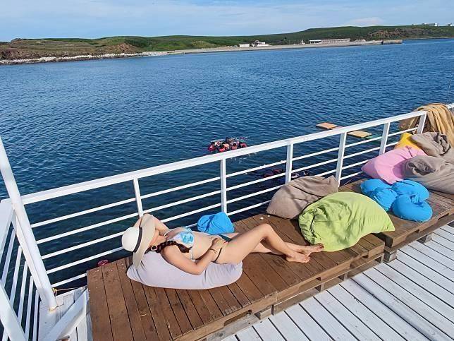 不想玩水也可以到二樓平台放空發懶,享受悠閒的海島假期。二樓布置得很棒,有許多特別設計的角落可以攝影取材。晴天的澎湖離島怎麼拍都美,蔚藍大海晴空碧洗,一點都不輸國外。