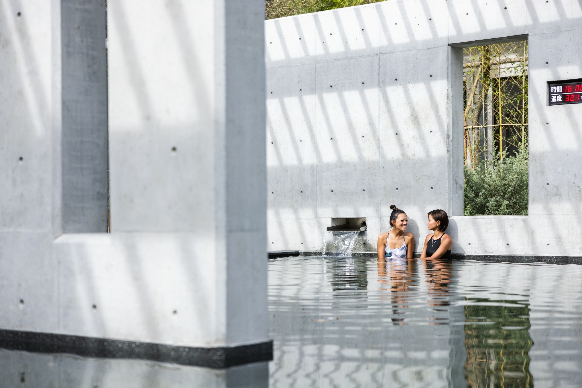 「台東紅葉谷綠能溫泉園區」中的溫泉泡湯區運用大量清水模設計進行空間區隔。圖片提供/雲品國際