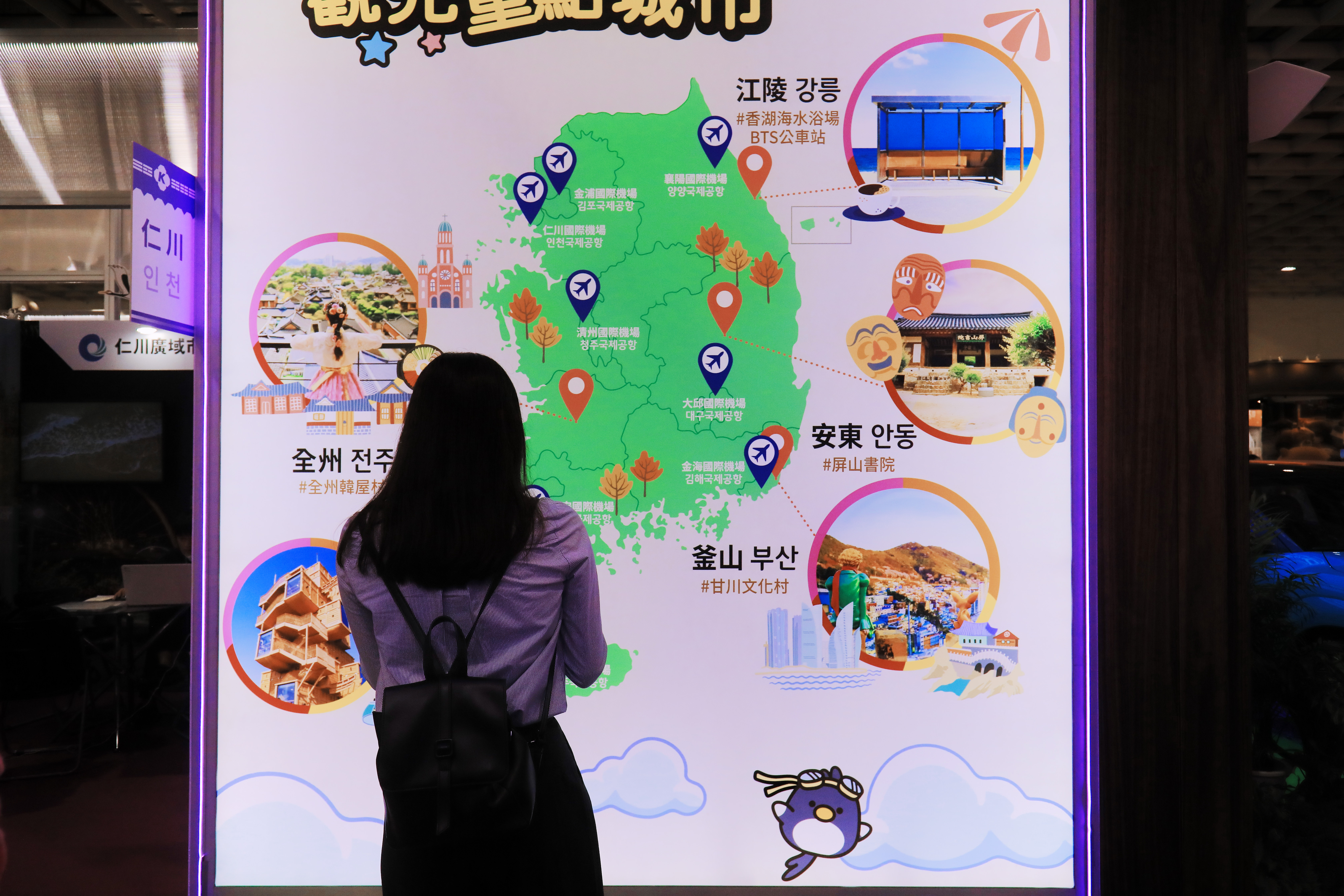 自11月起,台灣人赴韓旅遊免簽,僅需申請電子旅行許可,讓民眾遊韓意願增加不少。而在旅展中由韓國觀光公社統籌的韓國館,除延續「安心旅遊、就在韓國」的主軸外,展出方式可謂相當多元又極具巧思,分為舞台區、韓流區、自駕露營區、地方政府宣傳區、郵輪區、銷售區等六大區域,呈現韓國的多元旅遊面向。