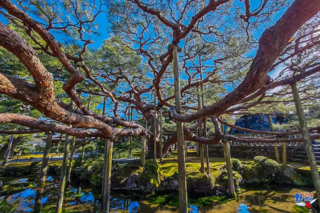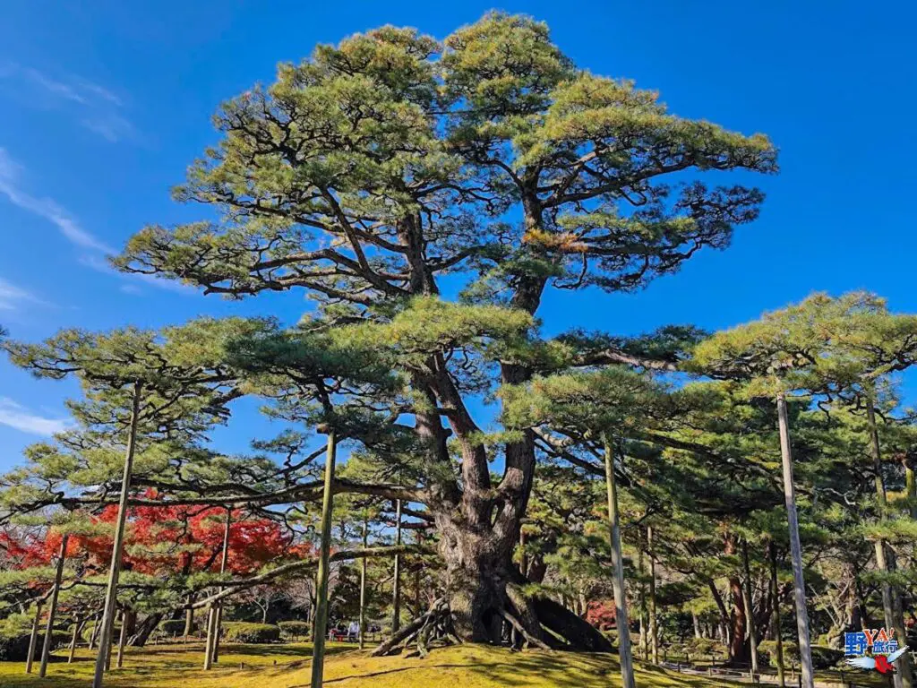 除了四季花卉,我覺得松樹是兼六園最美的樹種,不管是明治紀念碑旁的手向松、挺立的根上松行都蒼勁有力,尤其是以大廣角拍手向松更是張力十足,明治紀念碑兩側的赤松是從京都的東、西本願寺移植來的。