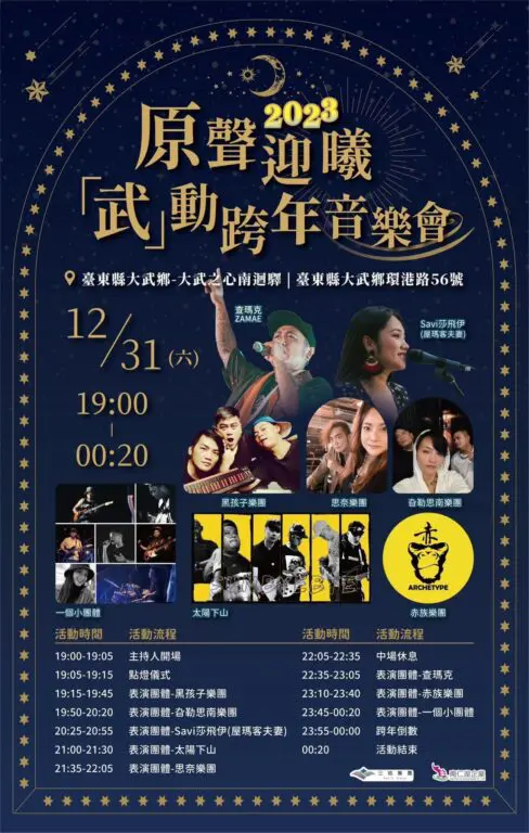 2023原聲迎曦 武動跨年音樂會將於今年10月開幕啟用的大武之心南迴驛舉辨,節目內容精采豐富,除了跨年倒數也邀請黑孩子樂團、屋瑪客夫妻、太陽下山樂團、思奈樂團、查瑪克等在地原住民表演團體登台演出,與大家一同迎新送舊揮別2022年的疫情陰霾。