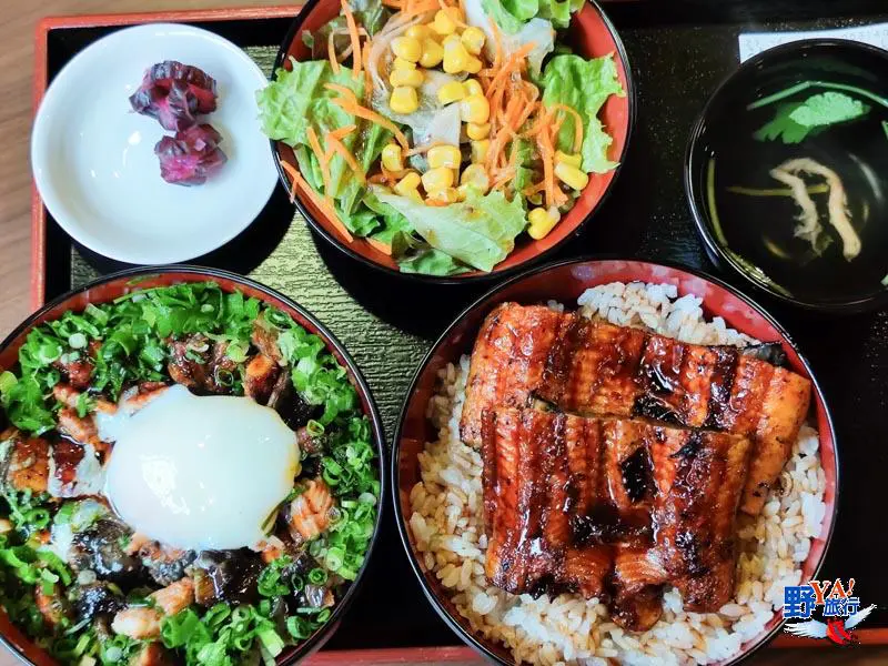我們點了一份うな丼ダブル雙倍鰻魚飯(1100円)與鰻魚蛋飯,這鰻魚蛋飯同樣依照份量決定價格,最貴的也是1100円。點了兩個主餐再加點沙拉、湯品就是豐盛的鰻魚套餐。