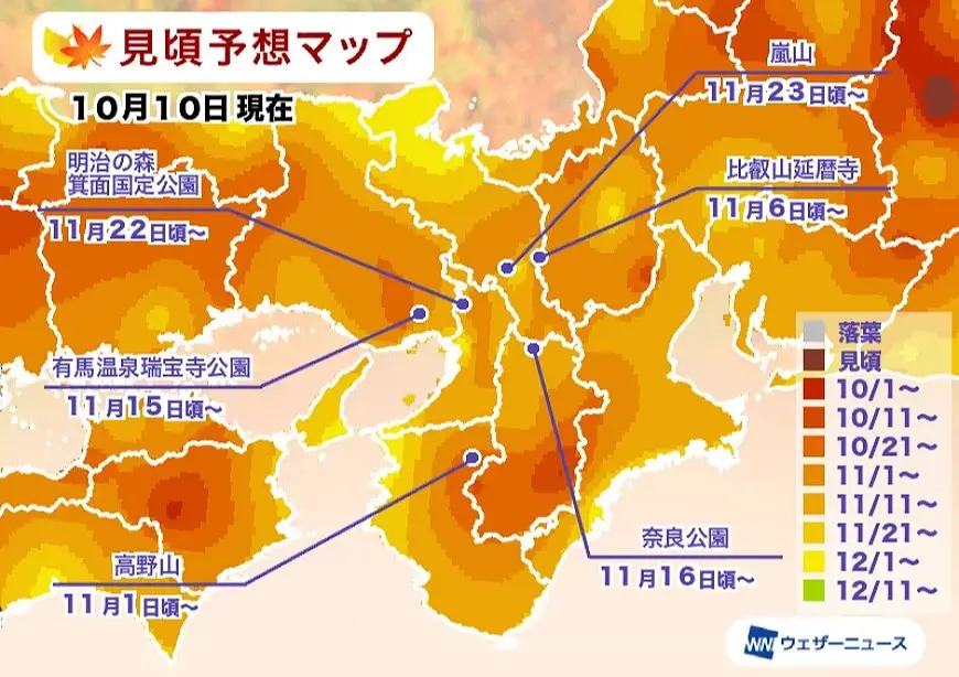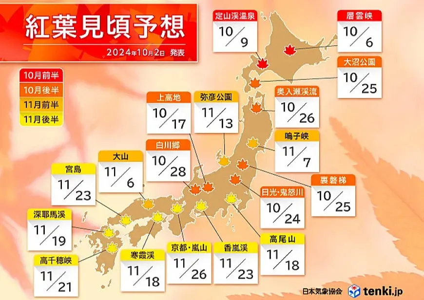 因此,晝夜溫差大的日子很少,但在日本北部和日本海一側地區,由於高壓,預計夜間晴天和寒冷的日子數量將逐漸增加。 此外,11 月,日本東部和西部的太平洋一側將有更多的晴天,晴朗的早晨會有寒冷的日子。 由於這些原因,今年的紅葉觀賞季節在日本北部和日本東部與往年相近,而西日本的觀賞季節也將與往年相仿。