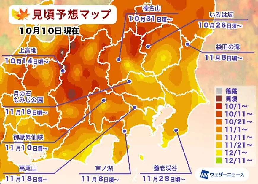 山區的最佳觀賞時間為 10 月下旬至 12 月初,平原的最佳觀賞時間為 11 月下旬至 12 月中旬。