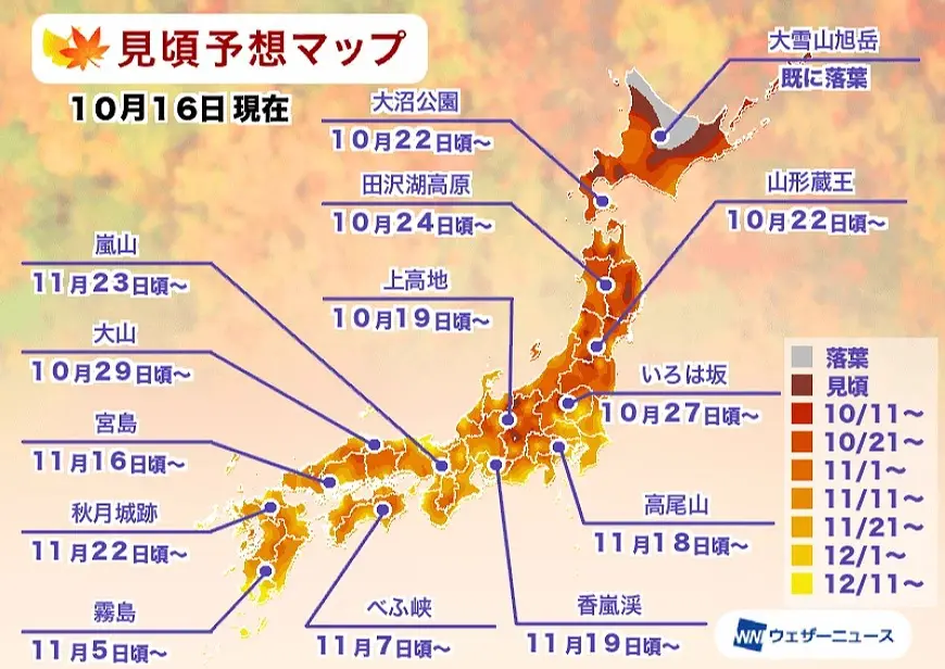 根據日本weather news 10月16日公布,日本東部和西部9月份的氣溫遠高於正常水準。 日本北部也變得很高,但下半個月有一段時間低於正常水準,因此顏色正在穩步變化,尤其是在山區,有些地方已經到達了最佳觀賞地。