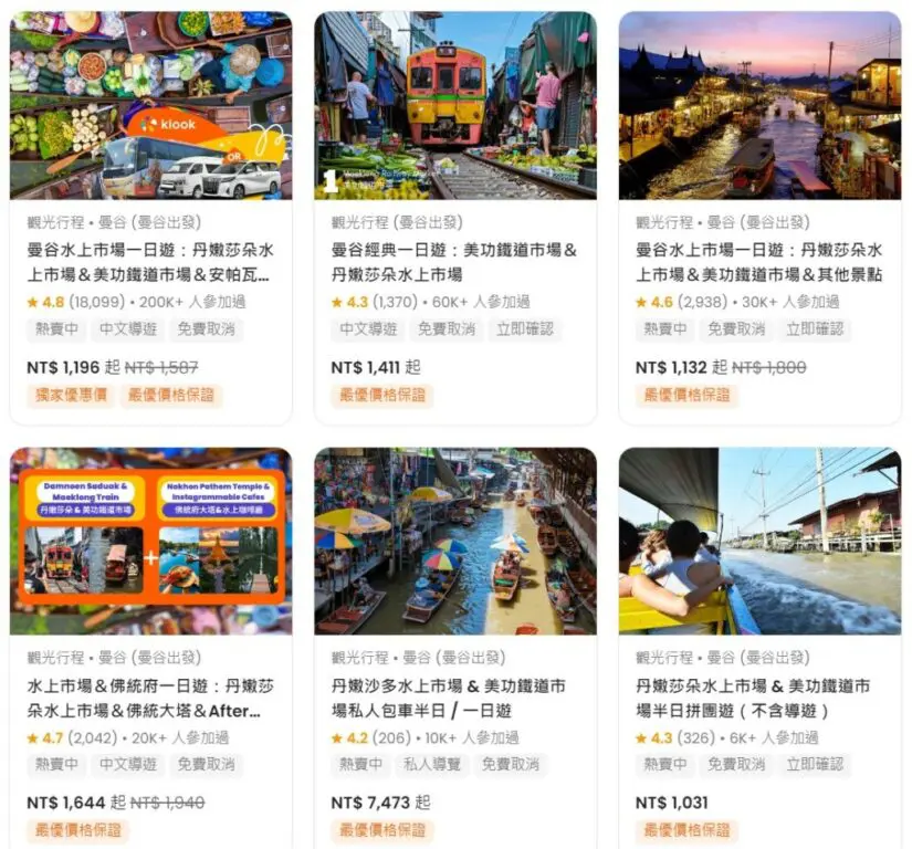 KLOOK推出多種不同的水上市場一日遊商品,通常早上10點出發先去美功市場然後去水上市場,而全包走法是假日一早從曼谷出發,先去丹能莎朵,中午在美功市場用餐拍火車,然後傍晚再到安帕瓦水上市場,晚餐後大約8點再折返曼谷,因為路途遙遠,通常回到曼谷就是逛夜市的時間了。東編也列出幾個比較高人氣的給大家嵾考,就看大家的預算與喜好來挑選。