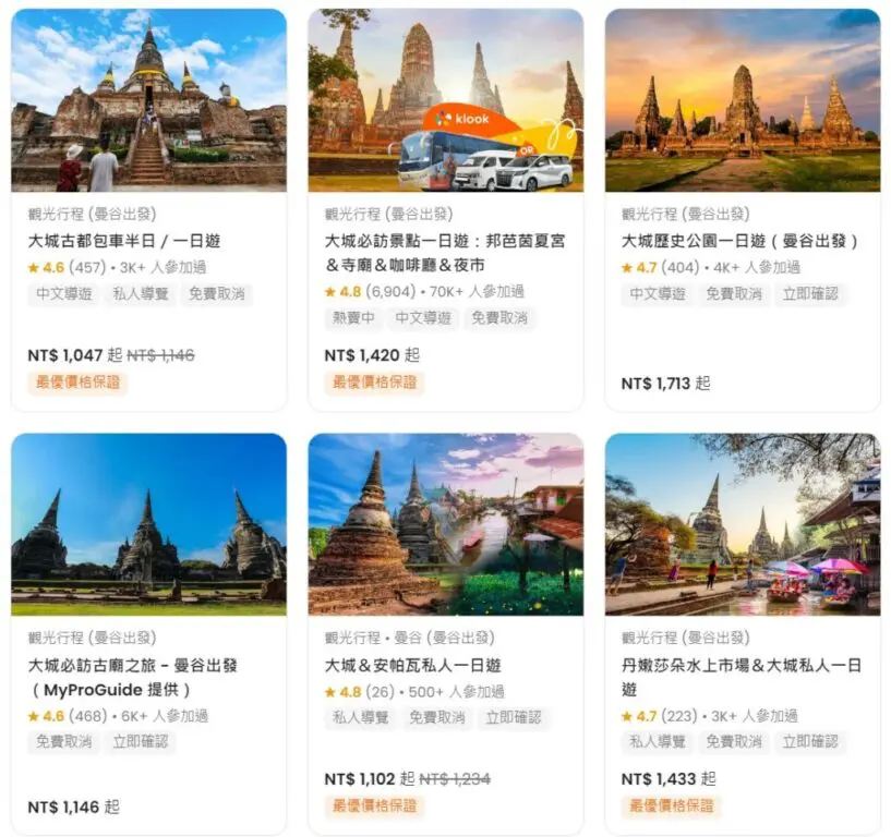 從曼谷到大城距離76公里,車程約1.5小時,一日遊行程途中會先參觀邦巴因皇宮,作為古代泰王的夏宮,金色的寶塔和寧靜的水池彰顯了該地區輝煌的過往。抵達大城府後,有幾個小時的時間探索迷人的古代宗教遺址,包括瑪哈泰寺,那裡有一個斬首的佛頭坐落在古老的樹根之間。