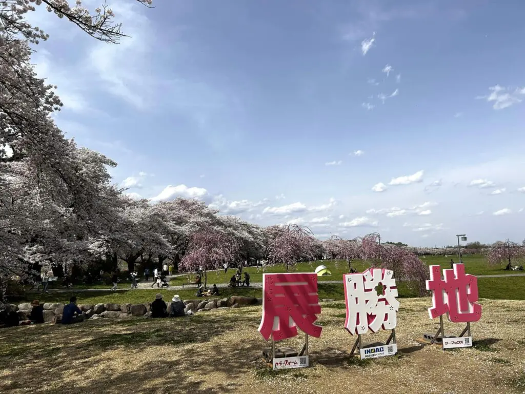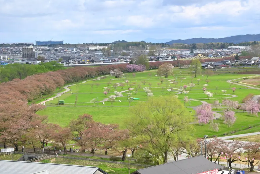 展勝地名稱由來就是從南邊這處土丘,可以將整個櫻花隧道、公園綠地與北上川盡收眼底。