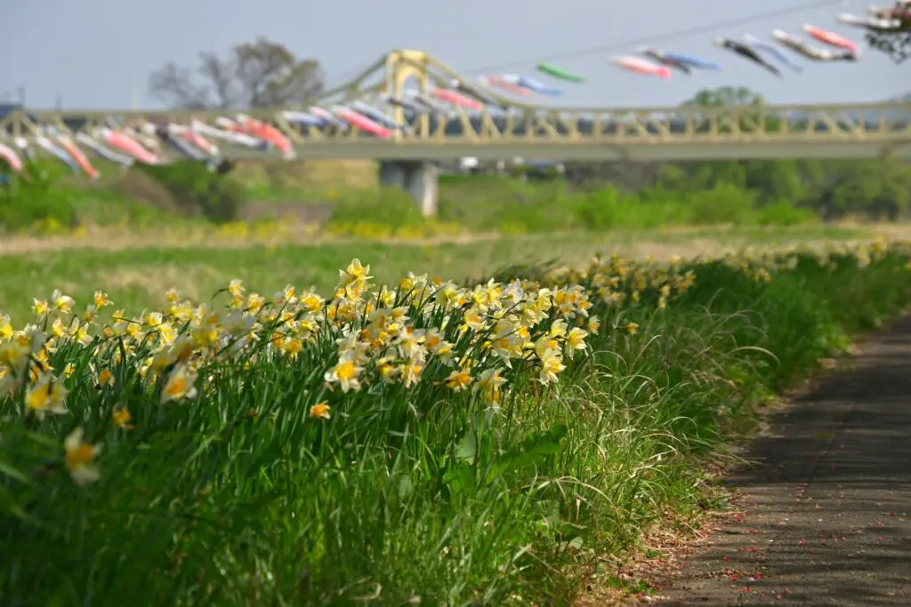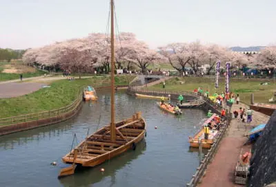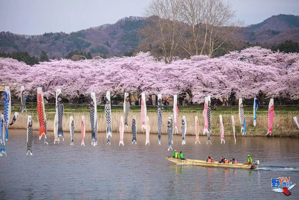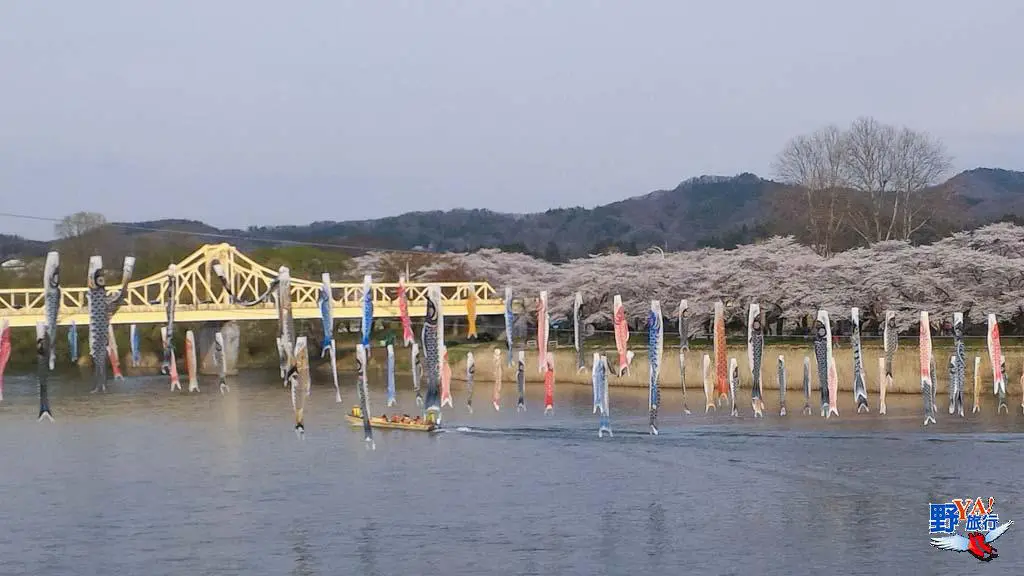 花季期間選擇搭乘渡船直接過河會比較輕鬆,也比較不浪費時間,可以多拍一些照片。櫻花祭期間,北上川會掛上許多祈福鯉魚旗,這也成為背上展勝地的特色之一。花季期間搭乘賞花遊船一路逆流北上賞花也是輕鬆又愜意。