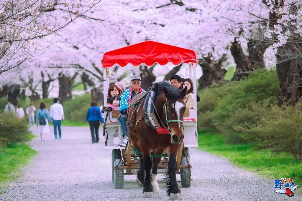 搭乘馬車一趟500日圓,走在這櫻花隧道馬路上還真是唯美浪漫,這邊有馬車、人力車、遊船可選,還會設置屋台販售燒烤美食、地方特產。