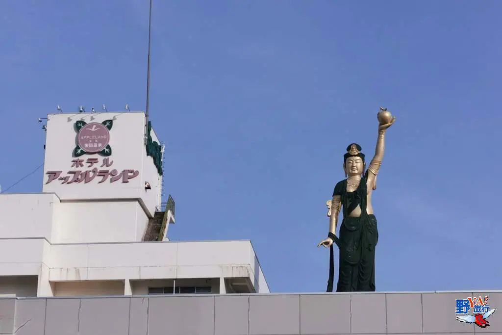 自駕是最好的方式,如果沒開車可以跟飯店預約弘前車站免費接送巴士接送。這邊離弘前站不遠,車程大約20分鐘,上車位置在JR弘前站東口(要事先預約)。還沒到飯店遠遠就建到這尊手舉蘋果的觀音聖像,這「蘋果大觀音」是在新建東樓時安座,為了保祐蘋果等農產品年年豐收,館內也供奉觀音像,有許多求子的旅客專程來參拜。