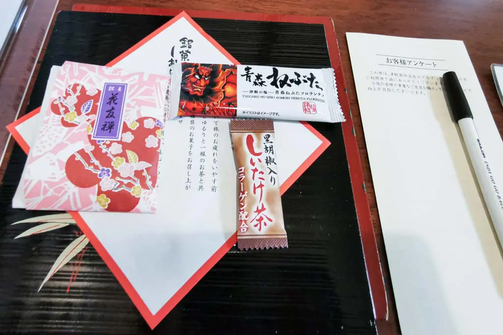 房間裡提供青森出產的名產、胡椒椎茸茶讓住客品嘗。