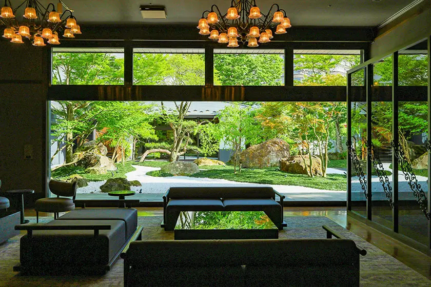 大廳酒廊,抵達時或泡湯後可免費享用酒精、軟性飲料、冰棒等。享受安靜的時刻,享受柔和的燈光、輕柔的音樂,並透過玻璃窗欣賞修剪整齊的花園的景色。