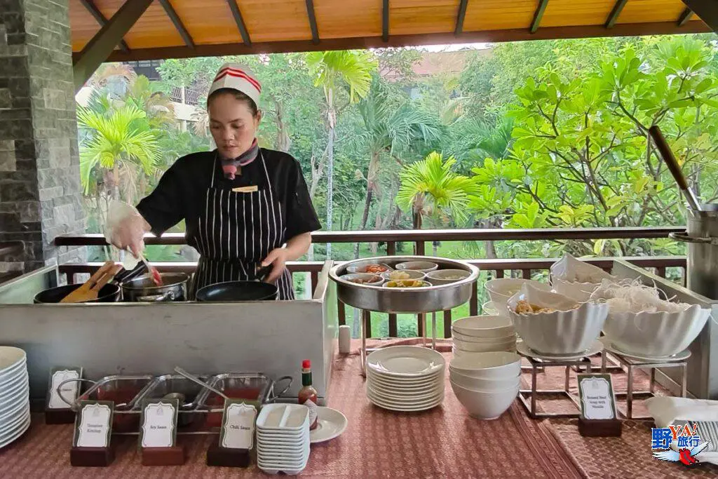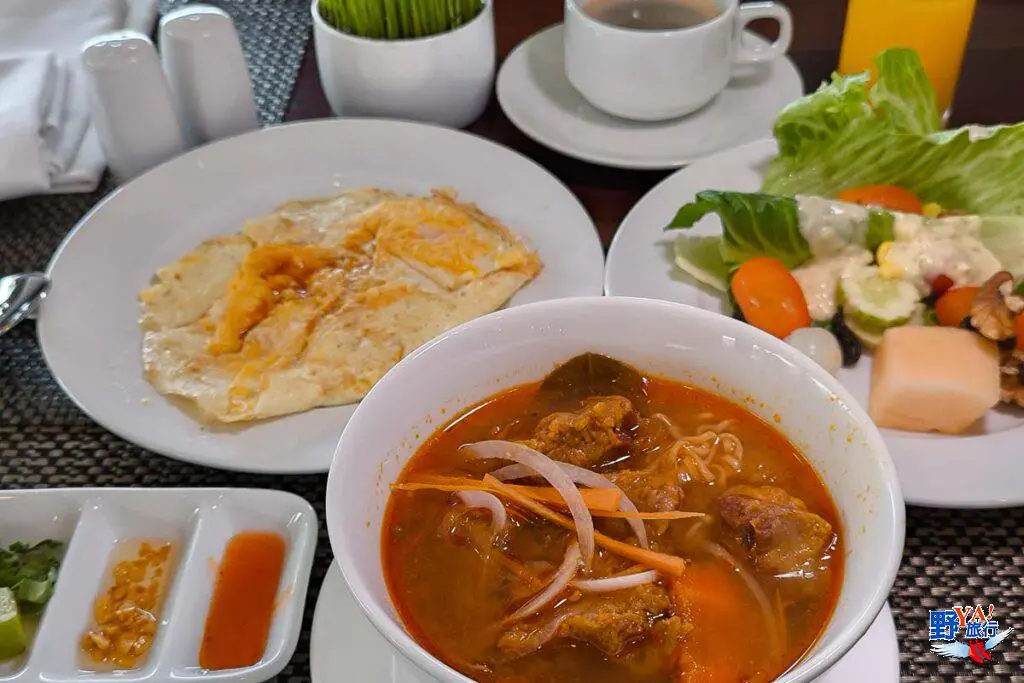因為是入住兩晚,今天不用一早收拾行李,可以好整以暇的享用早餐。餐點內容包括西式麵包、沙拉、現做蛋料理等,中南半島常見的河粉、米粉湯也都有供應。湯頭酸辣美味,讓人忍不住一口接一口。