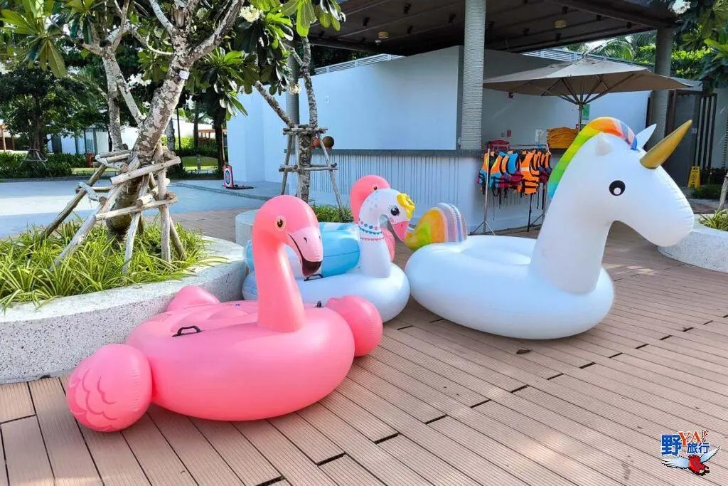 水深較淺的區域是兒童戲水區,這裡也提供獨角獸、天鵝、火鶴造型的游泳圈,這些不僅小朋友喜歡,也是網紅美女拍照最佳道具。