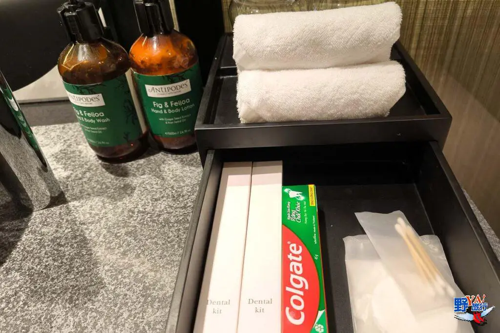 備品的部分採用Antipodes大瓶裝洗髮精、潤髮乳、沐浴乳、乳液等香氛產品,牙刷牙膏、棉花棒、浴帽等拋棄式備品一應俱全,還有燈光化妝鏡、大吹風機,浴室整體設計合理,使用很順手。