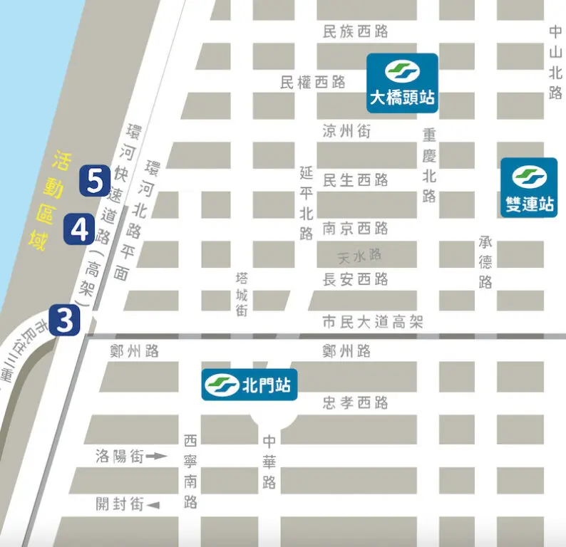 - 北門站(松山新店線):沿鄭州路往西步行約10分鐘即可到達3號水門。