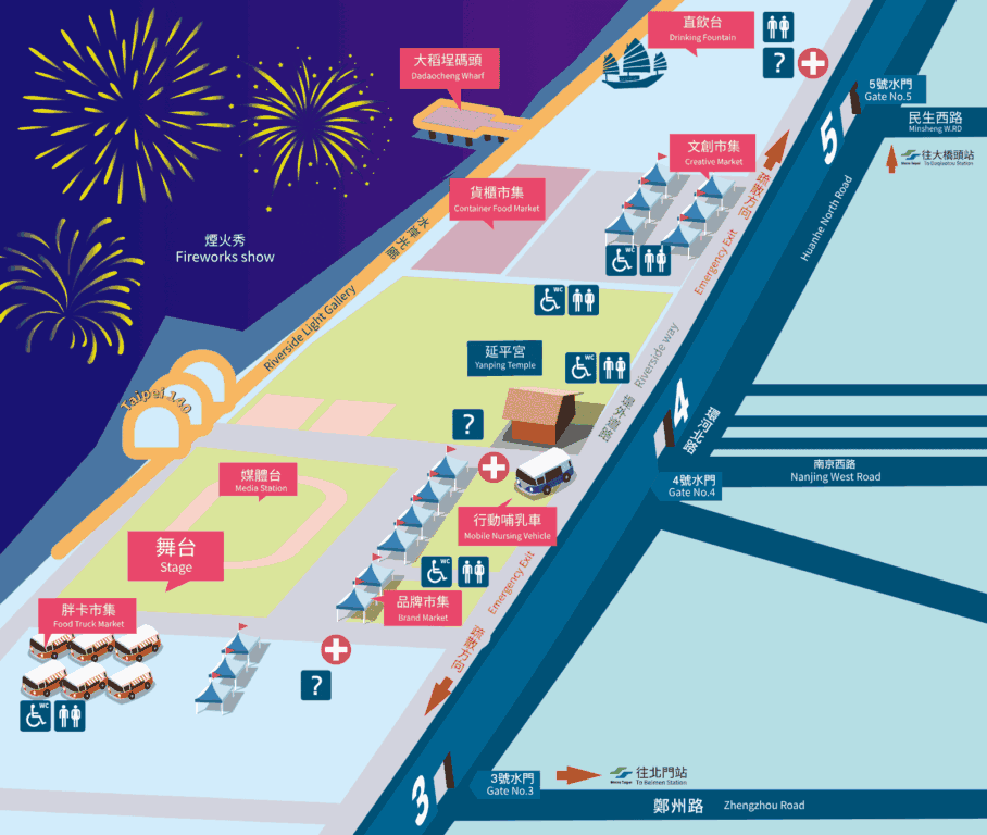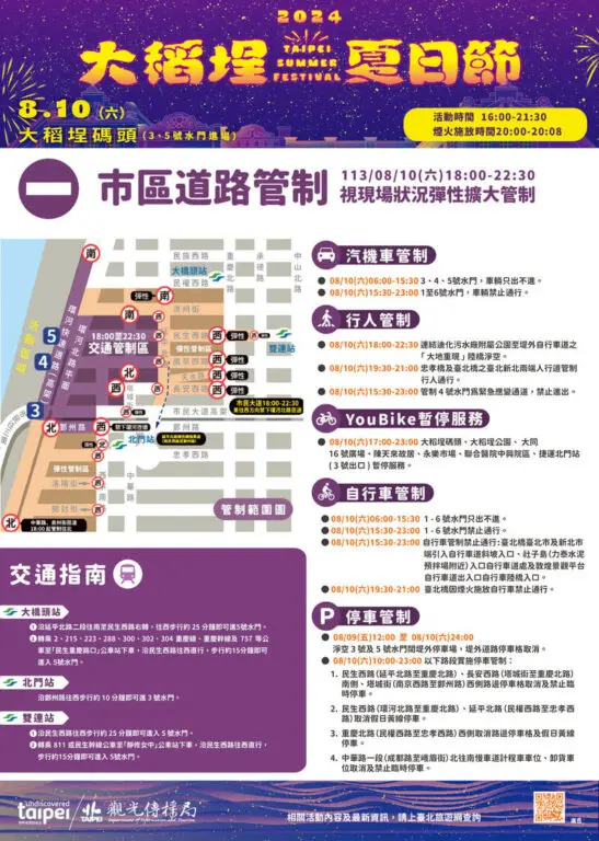 如何抵達大稻埕碼頭?因交通管制,且現場不提供汽機車停車位,交通局建議民眾搭乘大眾運輸前往觀賞煙火;或將車輛停放於外圍道路,再步行前往。
