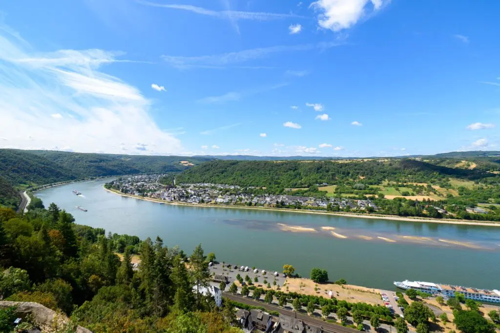 萊茵河畔有個酒城的小鎮『呂德斯海姆Rudesheim』是萊茵河高地區的中心點,自古羅馬時代即開始栽種葡萄,是德國具代表性的葡萄酒產地之一。鎮中心的「畫眉鳥小巷Drosselgasse」是具代表性的一條老街,好像家家戶戶竭盡全力在布置門面,充滿了當地的特色風格,十分精彩。經過科布倫茲 Koblenz來到『萊茵石城堡Rheinstein Castle』居高臨下的欣賞兩岸風光。
