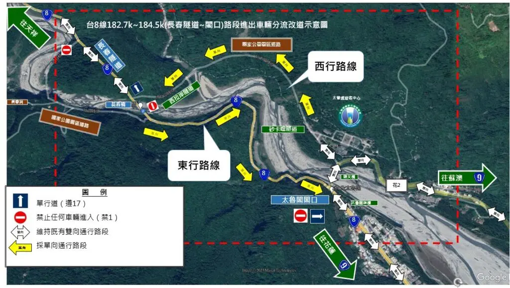 公路局東區養護工程分局太魯閣工務段原於今(19)日清晨實施中橫公路台8線關原至太魯閣(116.4k~184.5k)預警性封閉道路,上午雨勢稍緩,經工務段巡查並搶通沿線災況後,考量沿線民生需求,已於上午10時起戒護旅宿業者接駁車前往天祥疏運旅客,並恢復原訂每日「關原至天祥(116.4k~167.1k)日間開放通行」及「天祥至太魯閣(167.7k~184.5k)日間五次(06:30~08:00、10:00~10:05、12:00~13:00、15:00~15:05、17:00~17:30)開放通行」等措施,但因颱風環流尚未完全脫離,仍不排除視後續天候及路況變化,進行管制或封閉道路。