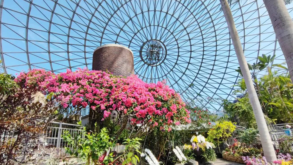 3.園區的中心點;,直徑 50 米、高 21 米的『圓頂花房』(南館),是「鳥取花迴廊」的象徵,以大王椰子樹等熱帶、亞熱帶的植物為主。園區非常貼心,花房以斜坡連接一二層,可以近距離觀賞這些植物。逛累了,可以到這商鋪買個冰淇淋解饞一下。