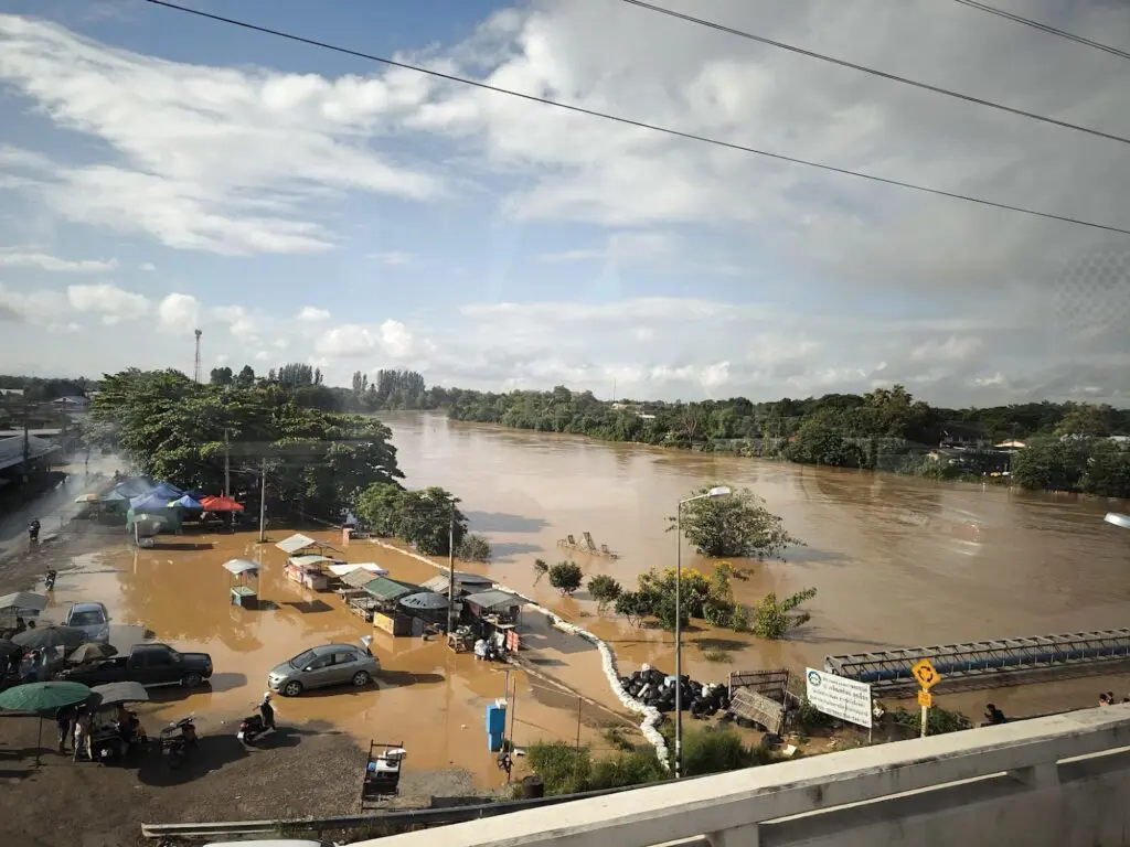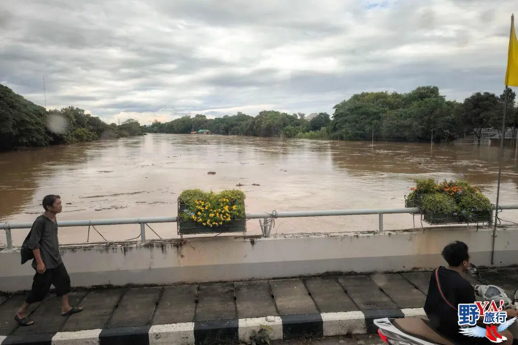 平河水位暴漲:平河的水位達到了50年來的最高紀錄,清邁市內的主要商業區和夜市都被淹沒,當地政府緊急疏散低窪地區的居民。我在逛夜市的時候就見到許多商家在門口擺了沙包、防水帆布準備擋水,果然第二天白天就看到真實淹水的情況。