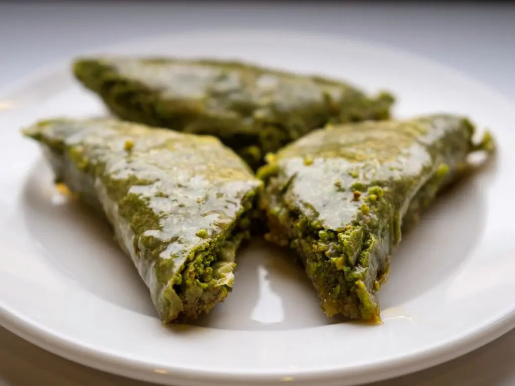 當品嚐加濟安泰普果仁蜜餅時,您首先看到它的金黃色,然後聽到菲洛麵團層的沙沙聲,聞到新鮮開心果和黃油的香氣。最後,它在口中留下非常清淡但甘美的味道。