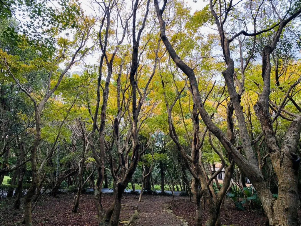此外,園區內種植了黃楓、青楓、唐楓等多種類型的楓樹,是欣賞楓葉的絕佳場所。雖然這裡沒有整片山頭楓紅的壯觀景象,但步道旁的黃楓與青楓層層疊疊的色彩,另有一番風味。漫步其間,陽光穿透層層樹梢,灑下柔和光影,整條步道瀰漫著秋冬特有的溫暖與靜謐。