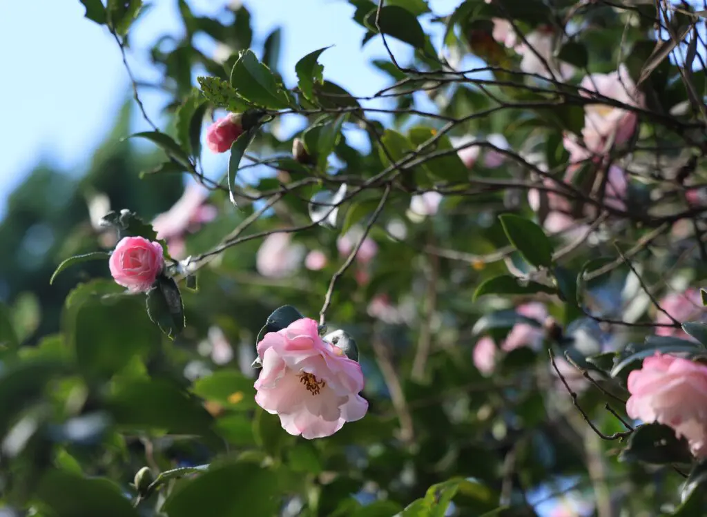 如果銀杏和楓葉是秋冬畫布的底色,那茶梅和茶花就是點睛之筆。茶梅的花瓣像雪片般飄落,茶花則是整朵豪邁掉落,兩種截然不同的花落,都為地面增添了更多色彩。雖然茶花展要等到明年1月,但由於中心內品種豐富,部分茶花已提前綻放,與茶梅一起繪畫出浪漫的秋冬。