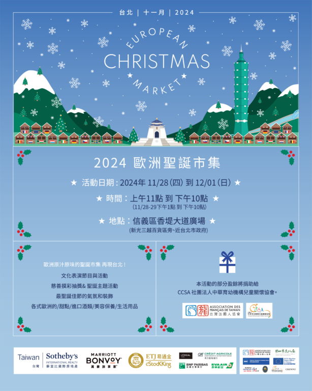歐洲聖誕台灣法國人協會主辦,台北市政府文化局、歐洲經貿辦事處、中華民國外交部、歐洲在台商務協會合辦。如同往年,歐洲聖誕市集的所有活動盈餘將全數捐贈給社團法人中華育幼機構兒童關懷協會,市集結合慈善,為弱勢兒童注入希望的曙光。