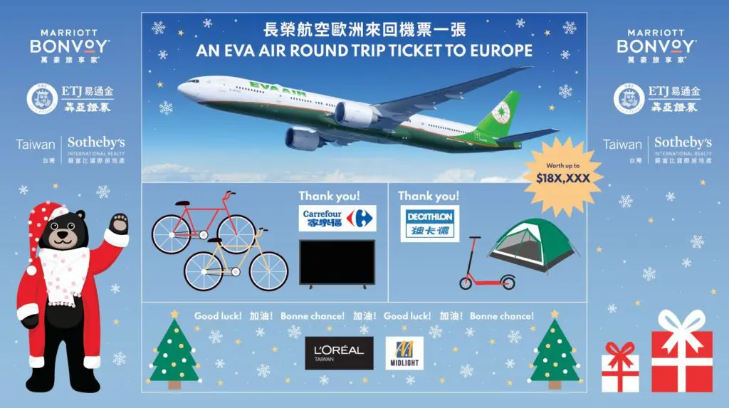 主辦單位也首次打造了活動拍照區,讓民眾可以拍照打卡留念,而繽紛聖誕主題屋內也將進行公益抽獎活動和聖誕老人合影活動。凡於現場購買聖誕樂透票券並參與抽獎就有機會將各式獎品帶回家,包含由長榮航空所贊助的最大獎— 長榮航空歐洲來回機票一張、超大液晶電視、高檔酒類飲品等!樂透票券營收將全額作為慈善募款資金,讓民眾拿禮物的同時也能盡一份心力做慈善。