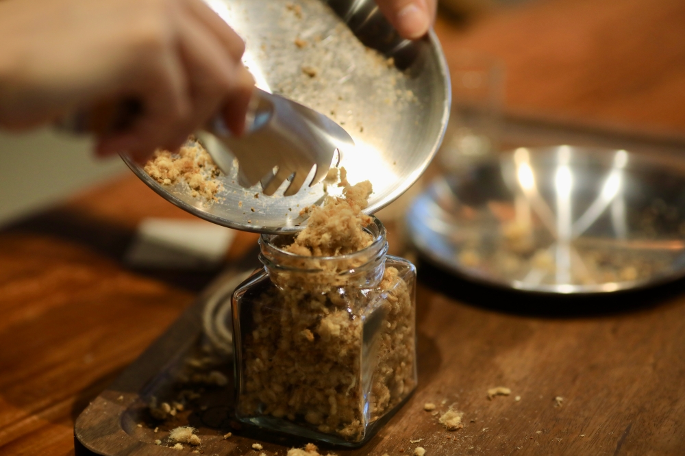 此外,脫線牧場除了販售自家手製的雞腿絲、雞腿條、雞肉酥之外,還能玩手作雞肉鬆DIY的體驗,過程輕鬆有趣,訪客會先換上圍裙、戴上可愛的雞冠等飾物,然後嘗試快炒已經處理過的雞肉絲,並於過程中添加孜然、馬告等各種自己喜愛的香料,完成後便可裝瓶,做出有自己風味的雞肉鬆。