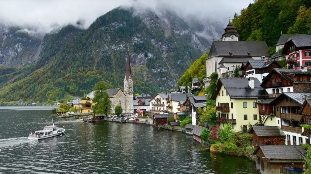 - 位於薩爾茲堡東南方的『哈斯達特Hallstatt』,屬於阿爾卑斯山群山環繞下的一個湖濱小鎮,是奧地利70多個湖的鹽湖區中最有名的觀光小鎮。晶瑩剔透秀麗湖面,穿梭的小船劃破粼粼波光,山坡上櫛比鱗次的木造建築,整個畫面完全符合童話仙境的美譽。