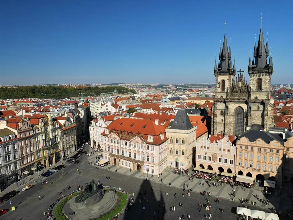 2.「布拉格廣場(舊城廣場)」:布拉格廣場四周由許多著名的建物所圍成,包括舊市政廳與天文鐘塔、提恩教堂、巴洛克風格的聖尼可拉斯教堂、洛可可風格的金斯基宮殿、哥德風格的石鐘之家,以及中央紀念揚·胡斯的雕像。