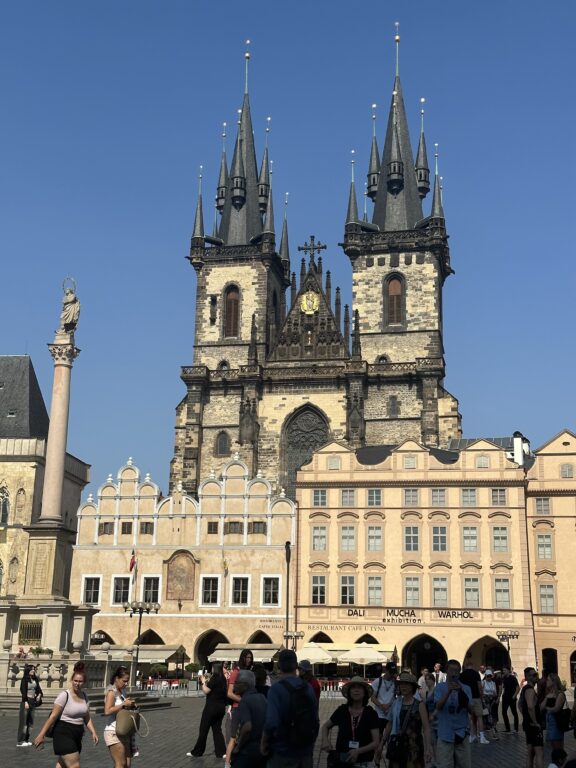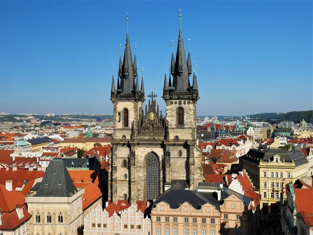 b.廣場上的「提恩教堂」建於17世紀,是舊城廣場最古老的建築,左邊的北塔被稱為夏娃,右邊的南塔則為亞當,看似相等的兩座高塔其實為不對稱造型,南塔比北塔還高約1公尺。