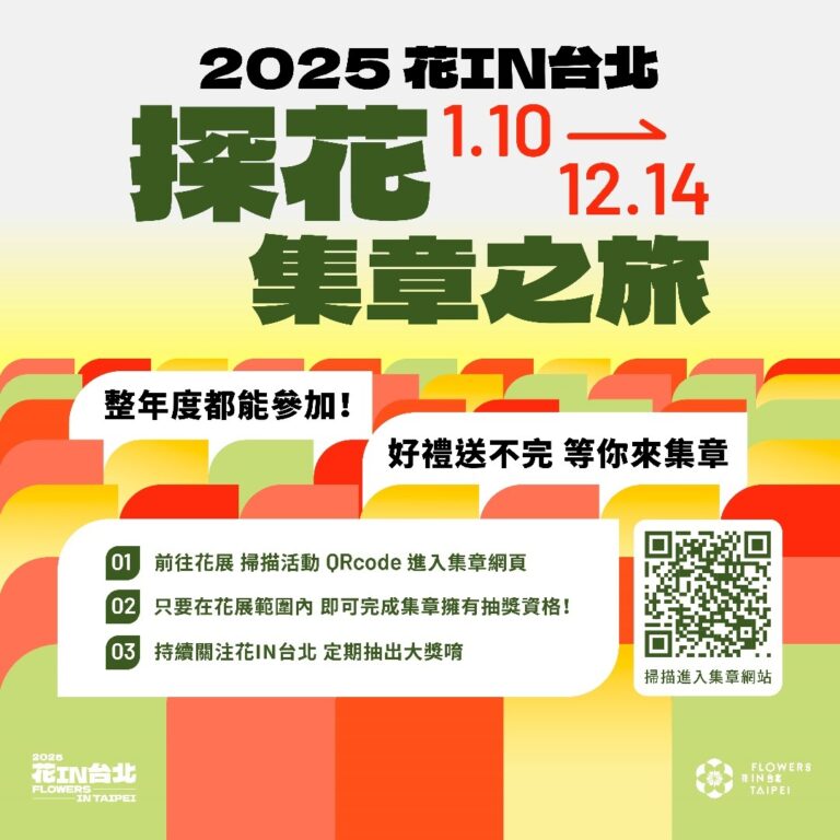 臺北市各局處用心舉辦各個花季活動,就是為了讓民眾能夠在參觀花季時,能收穫許多回憶和驚喜,除了依據每個時節的特色安排花季活動外,今年還特別規劃了「探花集章之旅」電子集章抽獎活動,讓大家漫遊台北花季的同時,只需要掃描活動QR code,即可蒐集到特別設計的花季電子章,每一枚章都烙印著曾經探索「花IN台北」花季的印記!活動另與花季週邊多間店家共同攜手合作,提供多種優惠餐飲和伴手禮,等你來拿喔!想知道2025年「花IN台北」還有更多精彩可期的活動嗎?請上「花IN台北」官網,台北第一手花季消息不漏接,讓美麗花朵豐富你的生活。