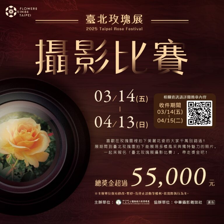 今年舉辦第二屆「臺北玫瑰展攝影比賽」,總獎金超過5萬5仟元,誠摯邀請喜愛拍攝花卉的民眾在展期間捕捉各種花姿,在鏡頭裡記錄下花展的豐富與多元,即日起至收件至4/15,詳情請參考簡章資訊。