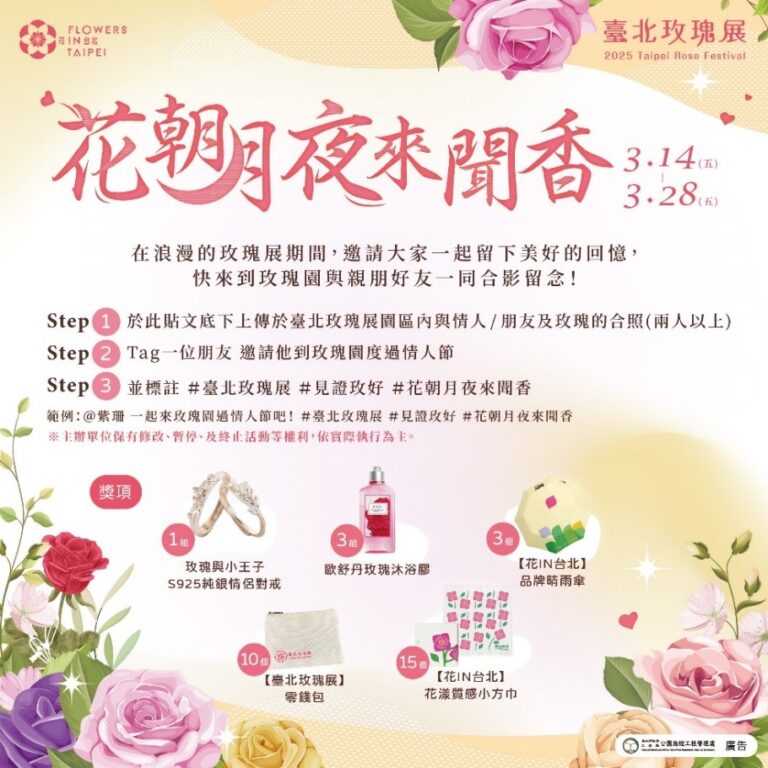 浪漫的白色情人節即將到來,2025臺北玫瑰展在今日(3/14)展開為期一個月的玫好篇章,配合情人佳節,邀請大家來到花團錦簇的玫瑰園「見證玫好」,展期間舉辦各樣精彩的線上及線下的活動,譬如延續辦理的「臺北玫瑰展攝影比賽」今(3/14)日起火熱開跑,歡迎攝影好手來玫瑰園取景,把獎金帶回家!第一波「花朝月夜來聞香」的線上抽獎活動也在今(3/14)日舉行,只要在活動期間於指定貼文下上傳兩人以上於玫瑰園內的合照,就有機會抽中好禮。