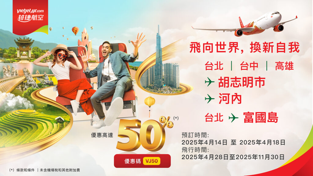 為歡慶越南統一紀念日,越捷航空即日起至 4 月 18 日推出限時全航線優惠!活動期間預訂Eco經濟艙,即可享最高五折機票優惠(未含稅金)。可透過越捷航空官網www.vietjetair.com或官方APP訂票,或輸入優惠代碼「VJ50」,即可享此優惠,適用搭乘日期為2025年4月28日至11月30日(不適用於越南國定假日)。