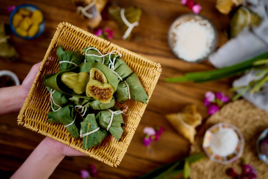 「素骨茶百菇香粽」添入馬來西亞肉骨茶特色,主廚以素食版肉骨茶辛香食材與米酒浸泡三日,充分釋放獨特微辣香氣,隨後與糯米拌勻,粽葉依序包裹營養豐富的猴頭菇、香菇與枸杞,入口鮮美不膩。至於甜粽「娘惹斑蘭椰糖粽」則結合台式客家粿粽與馬來西亞娘惹靈魂,以斑蘭葉汁調和糯米粉,加入椰子油揉成翠綠色麵糰,軟Q外衣下裹進由馬六甲椰糖、紅糖、椰絲與斑蘭葉翻炒而成的甜餡,無論作為正餐或飯後甜點,皆為佳節餐桌帶來一抹清新甜味。