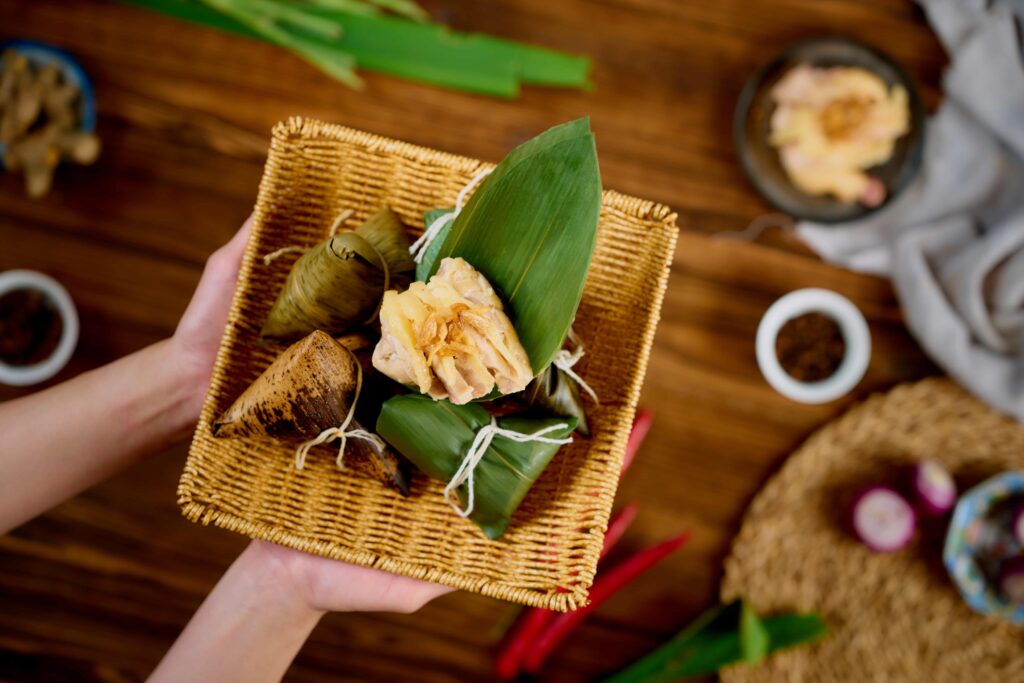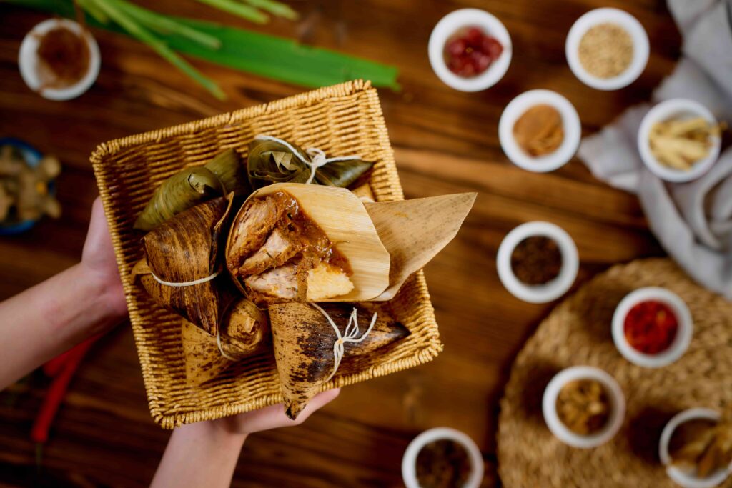 另款令人食指大動的「新加坡海南雞粽」是將糯米與斑蘭葉共同蒸過後釋放清香,再拌入紅蔥雞油、雞高湯使精華滲透米心、飽吸精華,餡料則以薑末、米酒及紅蔥雞油醃製去骨雞腿肉,搭配雞油精煉的紅蔥頭酥包裹其中,自餡料到米飯皆能嚐到層層堆疊的鮮香油潤,忠實還原記憶中熟悉又經典的海南雞滋味。