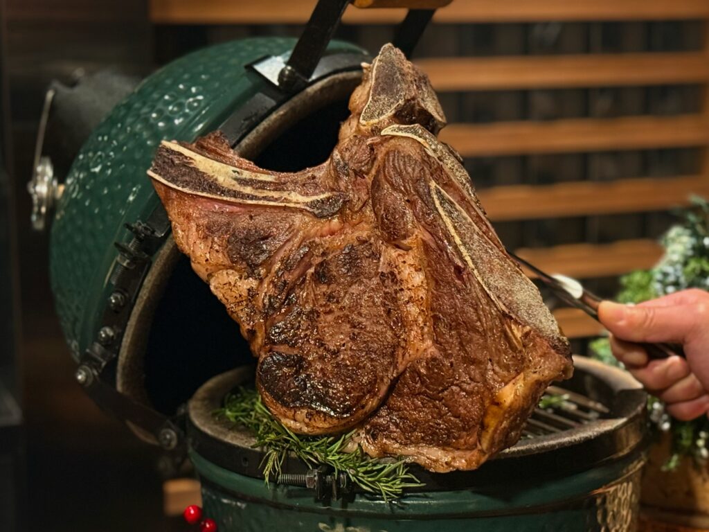 在各餐廳推出的母親節大餐當中,最為吸睛的首推二樓ROBIN’S牛排屋獨家引進的「日本F1帶骨牛排」套餐,共有肋眼與紅屋兩種部位可供選擇。日本F1牛肉是混血和牛,有著和牛細緻油花的特色、也不失香甜的肉感,主廚使用豪邁的直火炭烤,帶出特有油脂香氣,出菜前會使用特殊的爐具進行煙燻,展現爆發性的視覺效果。主餐選項另有日本A5和牛肋眼、美國頂級菲力牛排及西班牙伊比利豚上蓋肉等經典品項,皆含精緻前菜、小農沙拉吧、雙人湯品及母親節限定手作甜品,隨餐另贈玫瑰凍頂香檳烏龍乙杯,套餐售價每人4,680元起。