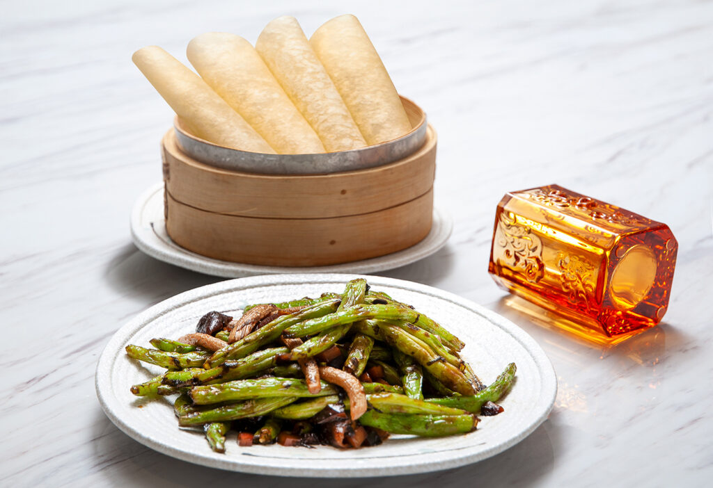 「青檸牛菲力」選用紐西蘭與澳洲進口菲力牛,以粵式煎封技術保留肉質鮮嫩多汁,佐上主廚特製醬汁與現刨檸檬皮,清爽果香與牛肉鮮甜相輔相成,是現代中菜精緻風格的代表。「藤椒炸蛋」將七分熟雞蛋酥炸至外脆內流心,搭配新鮮青藤椒醬汁,香麻撲鼻不嗆辣,酥嫩蛋體與藤椒清香形成鮮明對比,是層次感十足的創意川味小品。