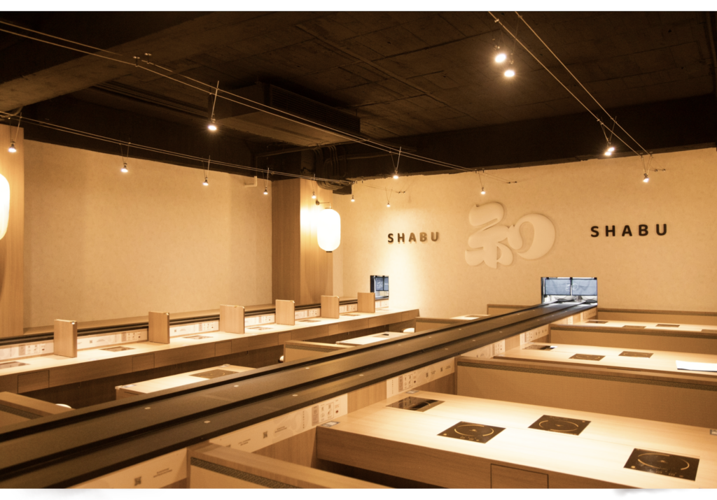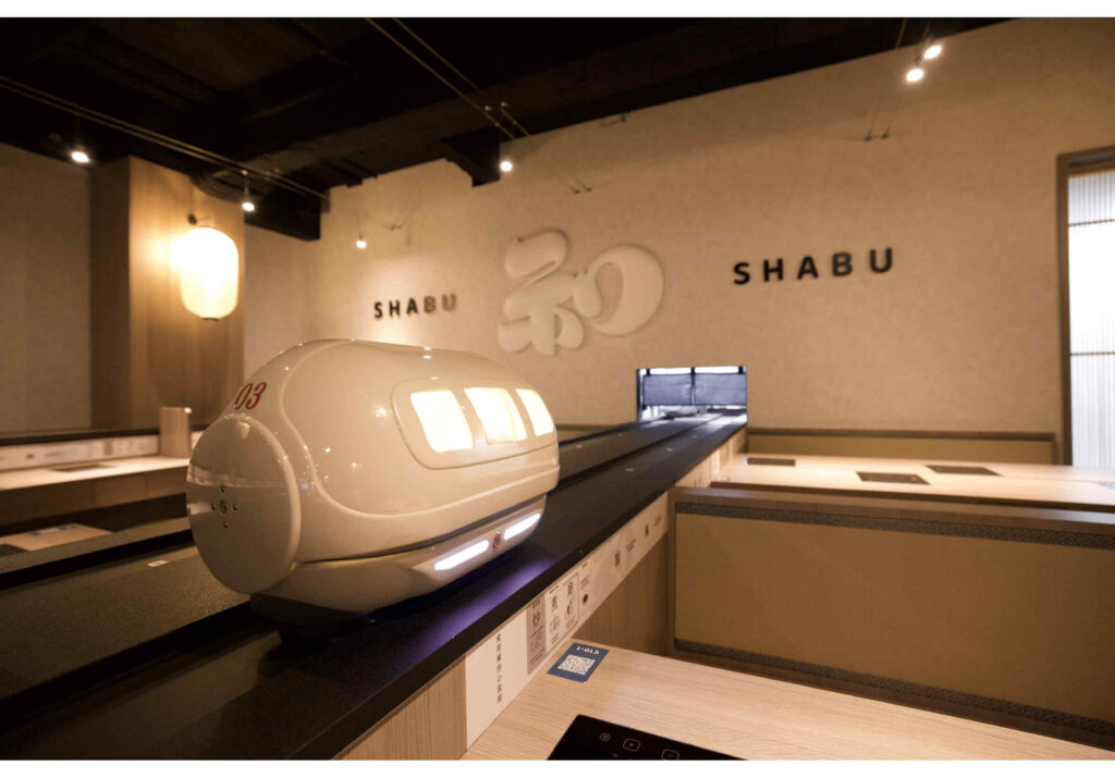在送餐部分,「和十Shabu」打造了創新可愛的AI智能軌道送餐系統,客人於帶位人員至座位後,掃描QR Code點餐,之後所有餐點將由一旁的AI智能送餐軌道系統,由客人座位旁的軌道將美味的餐點新鮮送至面前,衛生又便利,也能節省許多出餐時間。