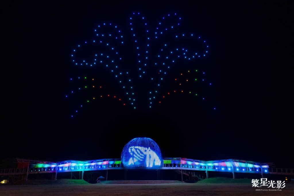 此次展覽核心作品「繁星光影」, 以直徑13公尺的光之球體為中心, 搭配超過萬顆點光源及兩側光織廊道, 形成如星河般流動的奇幻場景。每晚7點至10點, 每30分鐘一場聲光動畫秀動態展演吸引遊客駐足, 開幕日更有無人機編隊表演點亮夜空, 為臺東夜間觀光樹立全新標竿。