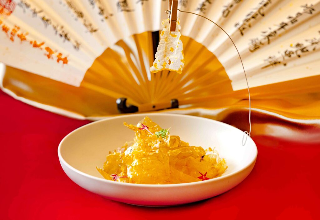 「東坡肉」則是千古傳頌的經典佳作,主廚此次以川味詮釋肘子部位,沿襲東坡所提的烹調訣竅—少水、慢火、酒香,並融入花椒與醬香,將肘子燉煮至酥而不碎、肥而不膩,層層膠質交織濃郁風味,相傳東坡在黃州時即以筍佐肉入饌,此番亦以筍共煮,細膩展現文人對火候與滋味的深刻掌握。