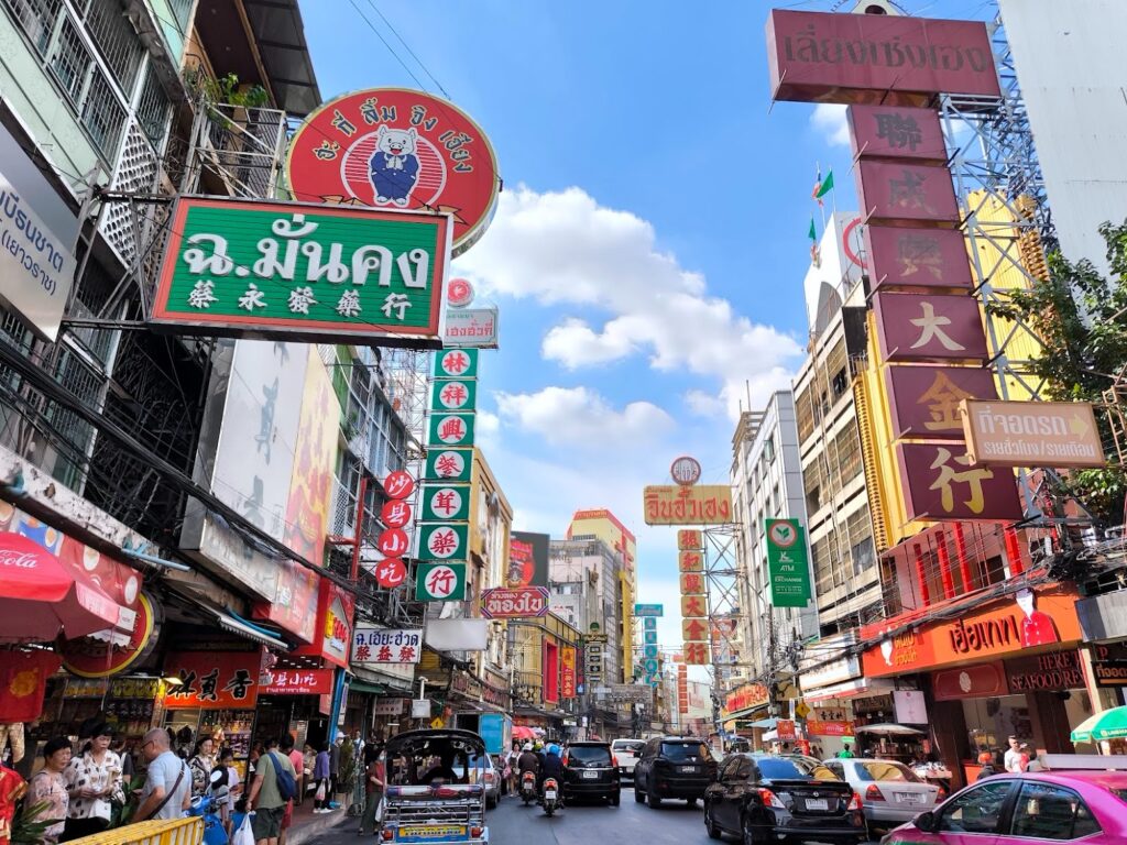 密集建築物群的耀華力Yaowarat路,滿滿都是秀著中文金店、鐘錶行的招牌,根本忘了身在曼谷。馬路兩排的小街小巷內,陳列著乾貨、茶葉、中藥鋪、燕窩魚翅的商店,還有不少巷弄的傳統美食,可以說是泰國華僑主要商業貿易中心,觀光客來此可以看看華僑在曼谷的生活方式。