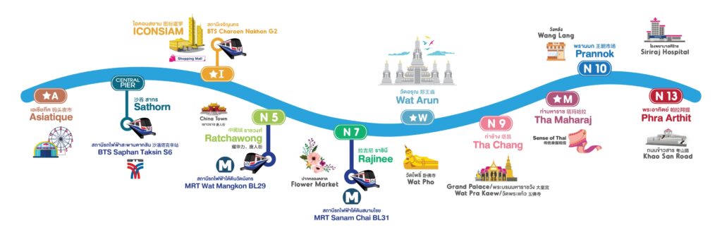 湄南河觀光船由北到南一共停靠12個大小碼頭,除了Asia Tique河濱夜市外,觀光客最常造訪的碼頭有:1~3碼頭為知名飯店群及River City Mall、5.6碼頭的中國城及傳統市場、8.9號碼頭皇宮廟宇,13號碼頭熱情的考山路,讓整個日遊行程豐富又精采。