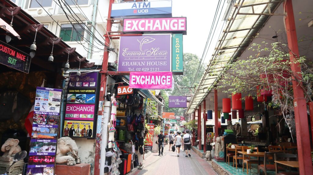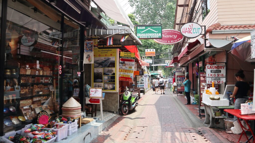 為了迎合歐美觀光客,考山路便開始經營各式老外喜歡的生意,讓現在長1公里的考山路有著太多民宿及經濟型飯店,其他的娛樂項目Ex.網吧、酒吧、餐廳、按摩院、市場攤位、紋身店..等等,更是族繁不及備載。