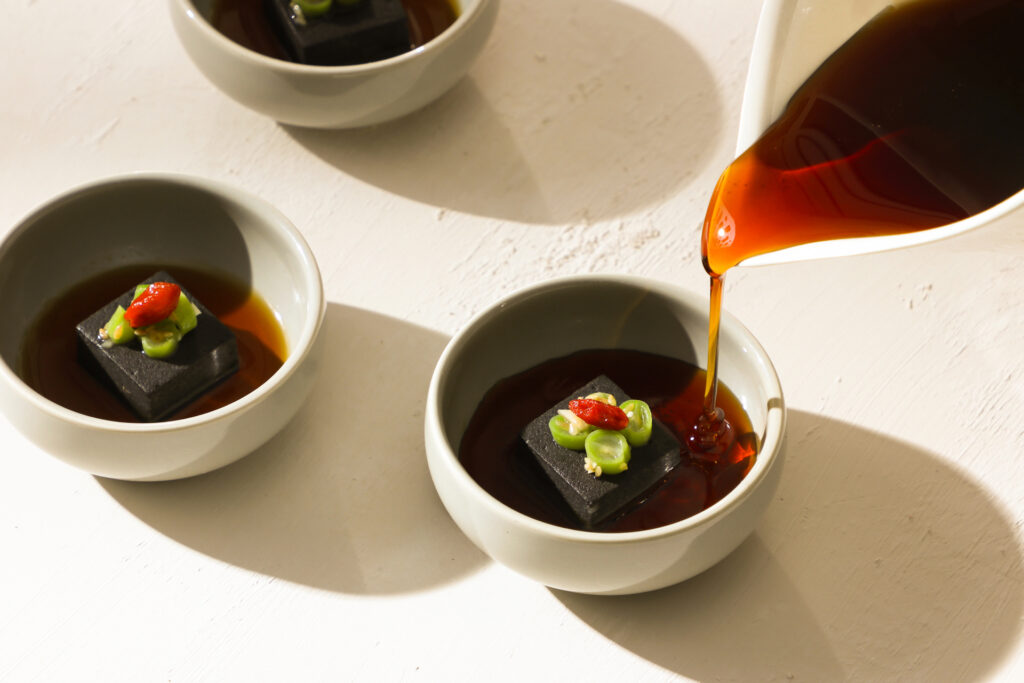 集團餐飲行政主廚呂尚澤領銜推出「陽光蜜香佛手沙拉」、「果韻琥珀排」、「醬露金墨豆腐」,創意蔬食結合佛手瓜細刨鮮薄片,襯以手撕莫札瑞拉起司與蒔蘿,交織出蔬食細緻。「醬露金墨豆腐」更以雙色胡麻呼應熊貓意象,早晨即能嚐到柔滑滋味。